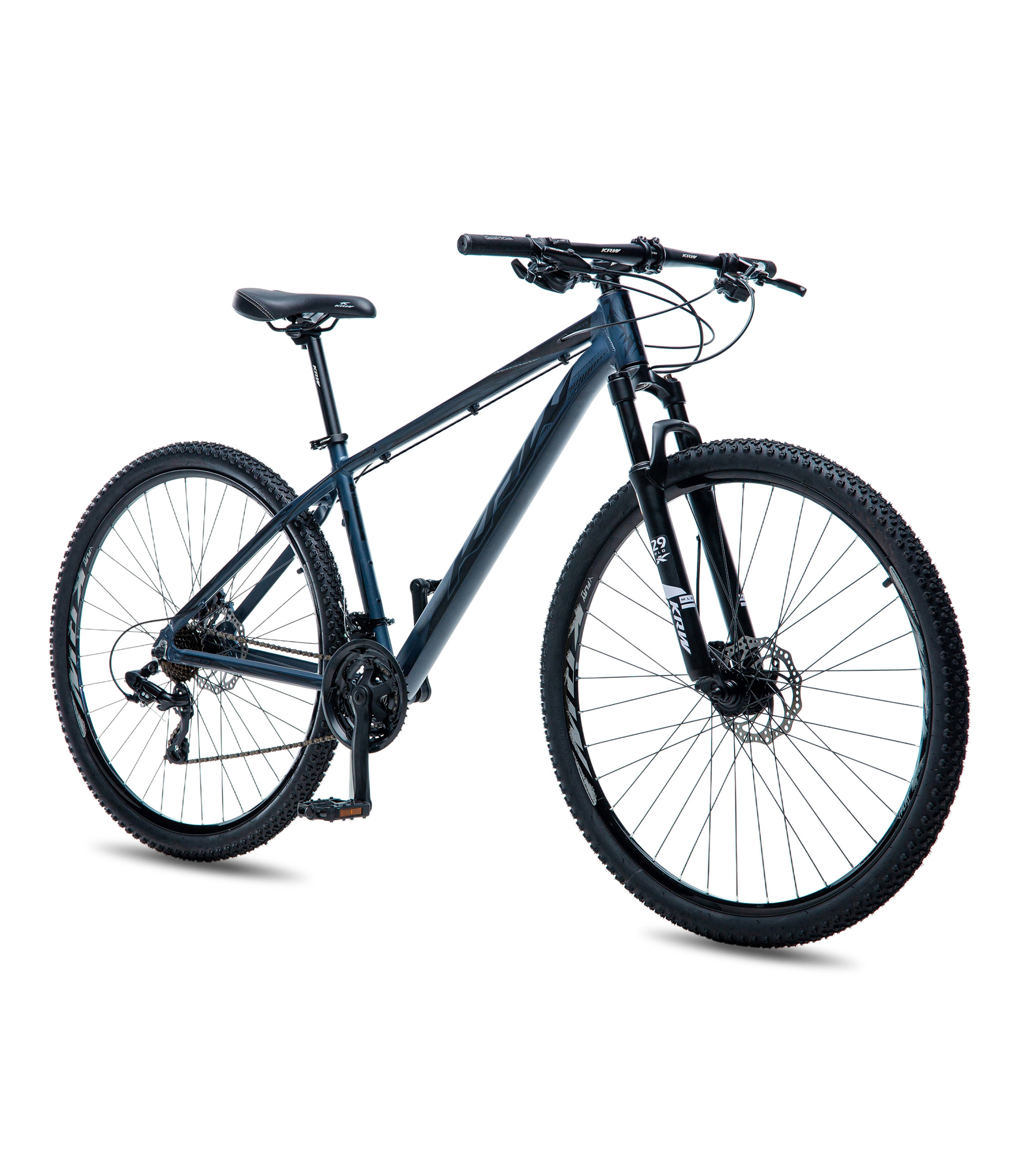 Bicicleta Aro 29 KRW Alumínio 24 Velocidades Freio à Disco W1 Grafite/Preto 21" Quadro em alumínio 6061 Abraçadeira alumínio de selim 31,8mm Alavancas EZ-fire Aro aéro 29 parede dupla Caixa de direção semi-integrado Câmbio dianteiro importado Cambio traseiro importado Pedivela triplo preto Canote de selim 27.2mm com carrinho Corrente index Cubo rosca com blocagem Espaçador alumínio 10 mm Garfo suspensão mecânica Guidão alumínio 31.8mm Kit cabo com conduiter Mesa alumínio 31.8mm Movimento central rolamentado 122mm Pedal nylon Pinça de freio a disco com rotor de 160mm Pneu 29 Raio 285x2.0mm aço preto Roda livre 8 velocidades index Selim mtb