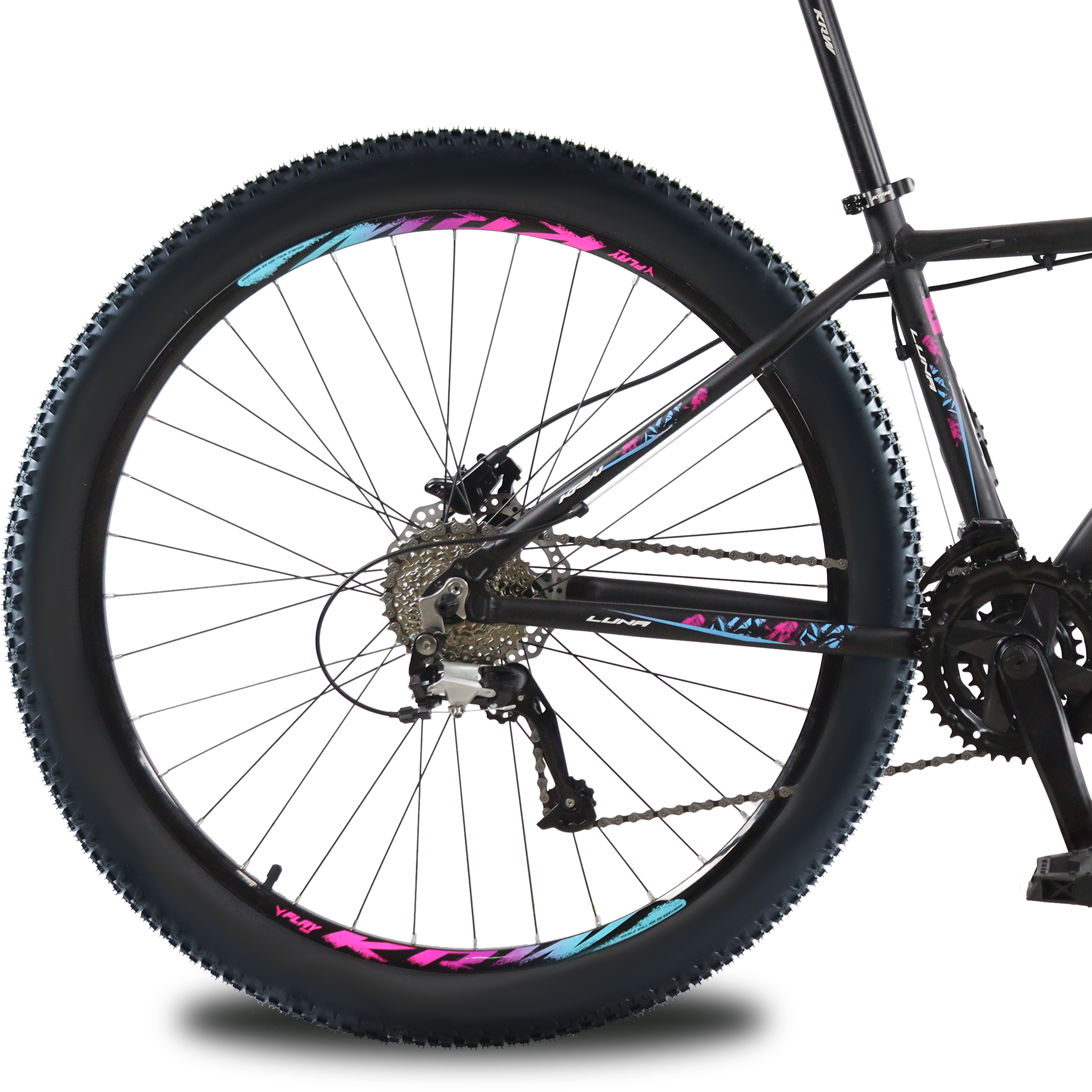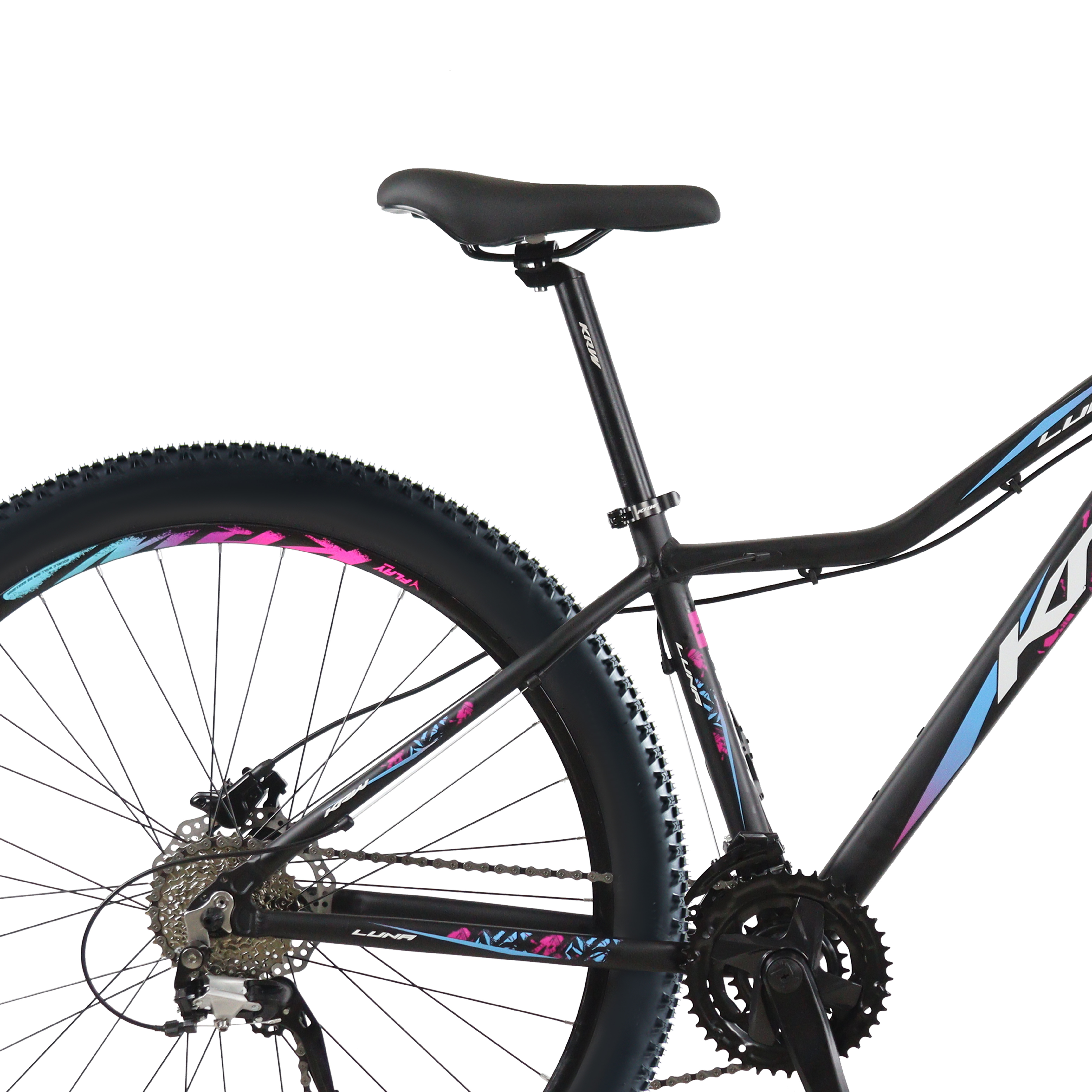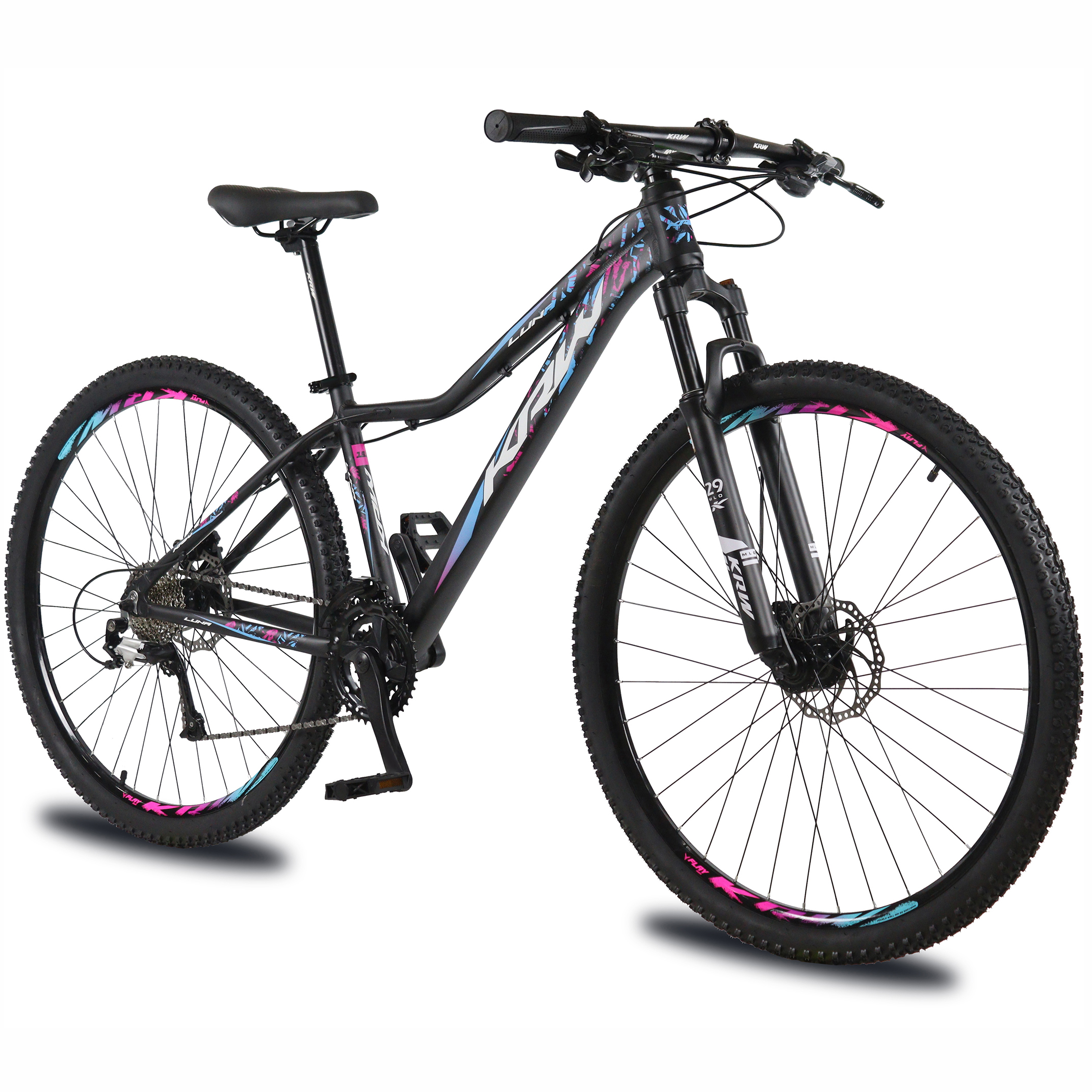 Bicicleta Aro 29 KRW Alumínio 27v Freio Hidráulico Cassete W4 Preto/Azul e Rosa 15.5" Quadro em alumínio 6061 Freio Hidráulico Abraçadeira alumínio de selim 31,8mm com blocagem Alavancas de câmbio rapid-fire 9 velocidades Aro aéro 29 parede dupla 36f Caixa de direção semi-integrado Câmbio dianteiro Importado Câmbio traseiro Importado Câmera de ar 29 Pedivela coroa triplo alumínio Canote de selim 27.2mm com carrinho Corrente index 9 velocidades Cubo alumínio cassete com blocágem Espaçador alumínio 10mm Garfo suspensão mecânica Guidão alumínio 31.8mm reto Mesa alumínio 31.8 mm Kit cabo com conduiter com teflonn Movimento central rolamentado 122mm Pedal plataforma com refletor Pneu 29 Raio 285x2.0mm aço preto Cassete 9 velocidades index Selim mtb