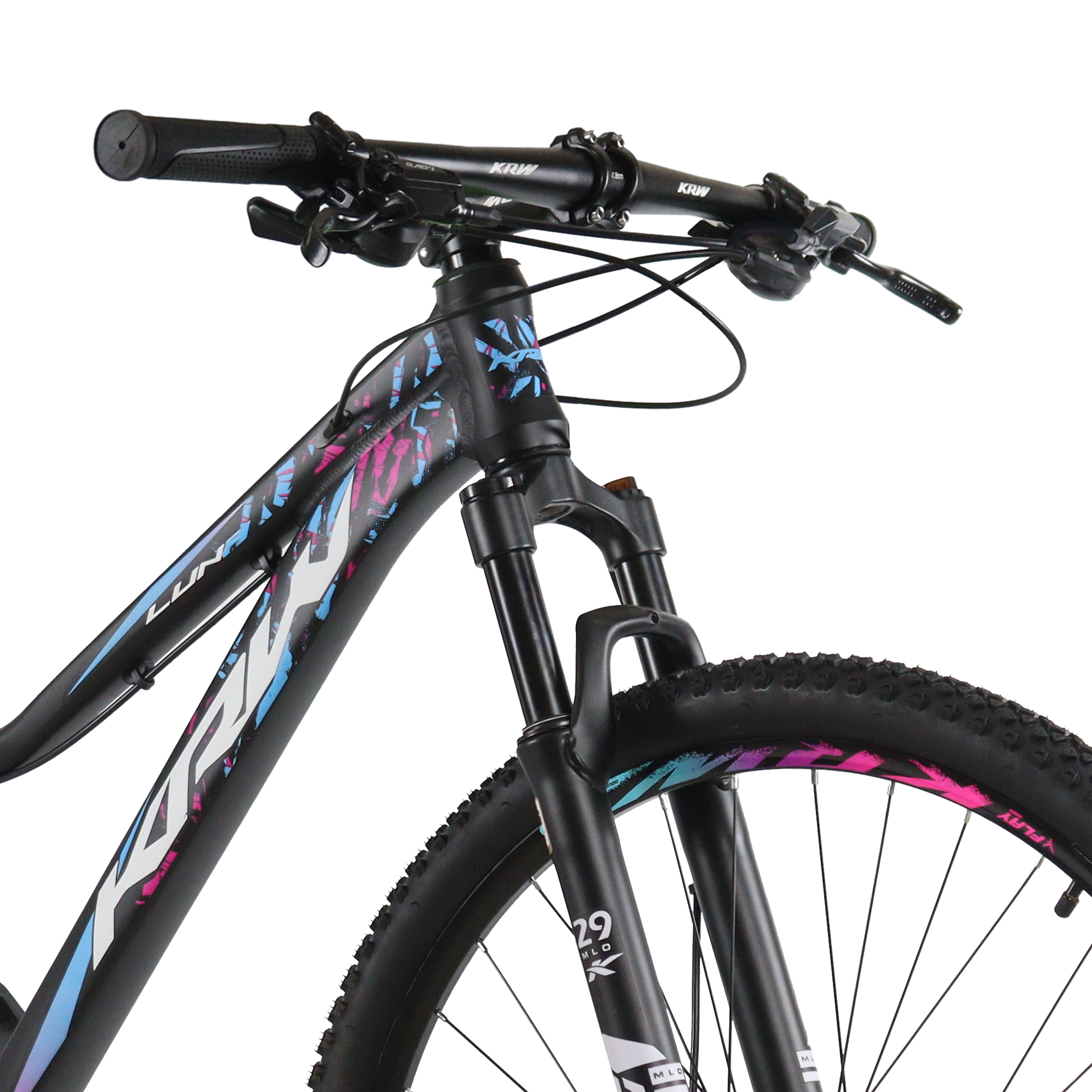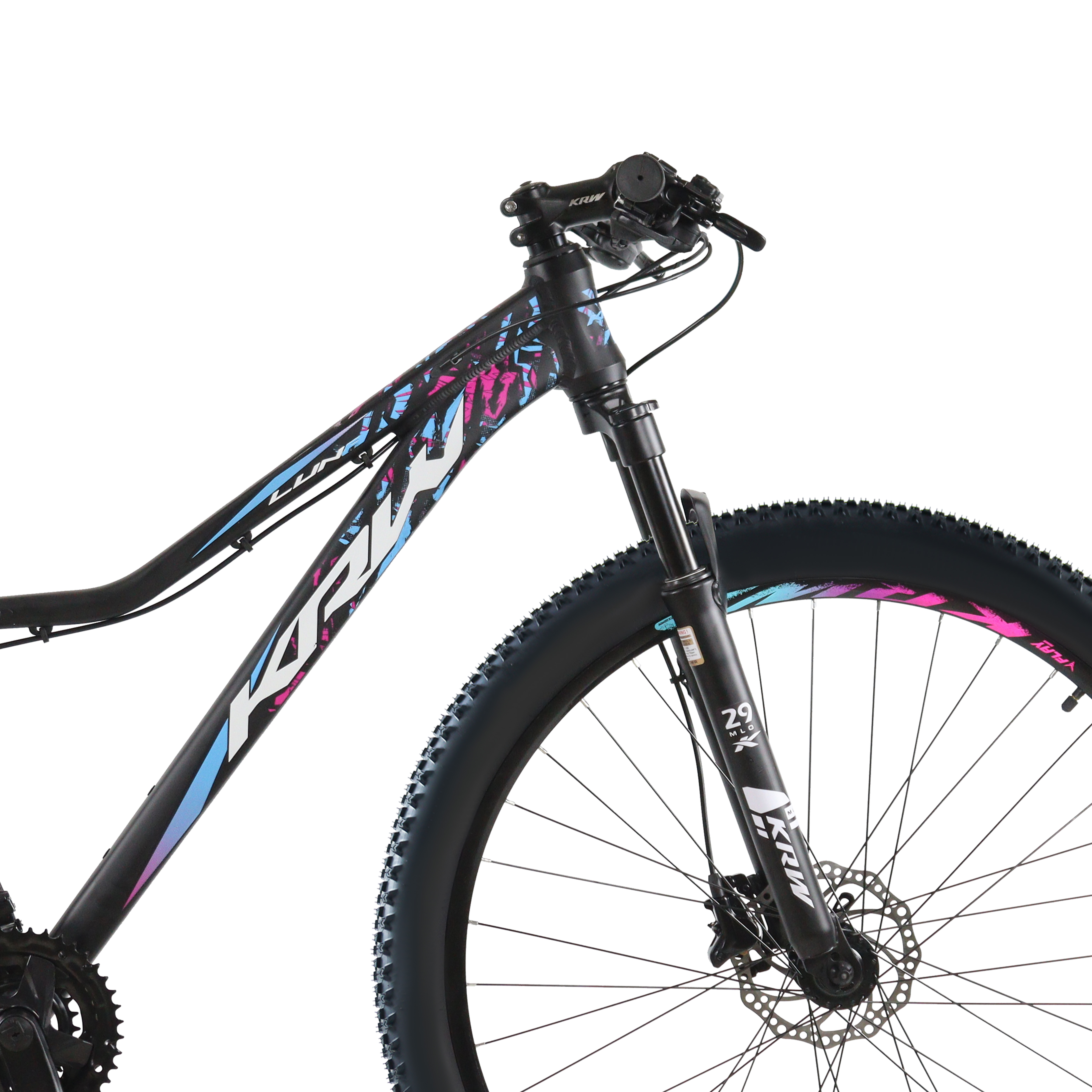 Bicicleta Aro 29 KRW Alumínio 27v Freio Hidráulico com Trava de Ombro Cassete W6 Preto/Rosa e Azul 15.5" Quadro em alumínio 6061 Abraçadeira alumínio de selim 31,8mm Alavancas de câmbio ez-fire 9 velocidades Aro aéro 29 pared dupla 36f Caixa de direção semi integrado Câmbio dianteiro Importado Câmbio traseiro Importado Pedivela aço coroa triplo revestido Canote de selim 27.2mm com carrinho Corrente index 9 velocidades Cubo com blocágem Espaçador alumínio 10 mm Garfo suspensão mecânico Guidão alumínio 31.8mm reto Kit cabo com conduiter com teflonn Mesa alumínio 31.8mm Movimento central rolamentado 122mm Pedal em nylon preto Pinça de freio a disco com rotor de 160mm Pneu 29 cravos Raio 285x2.0mm aço preto Roda livre de 9 index Selim mtb