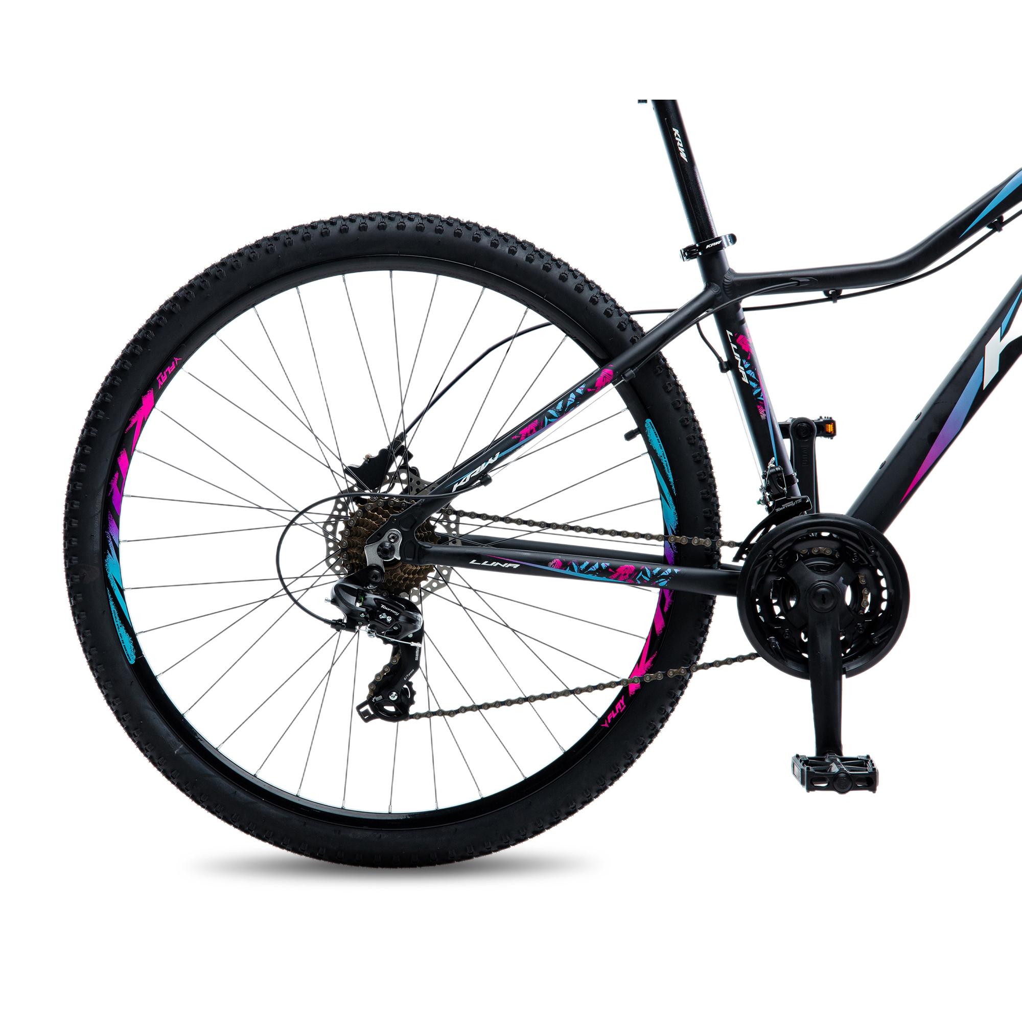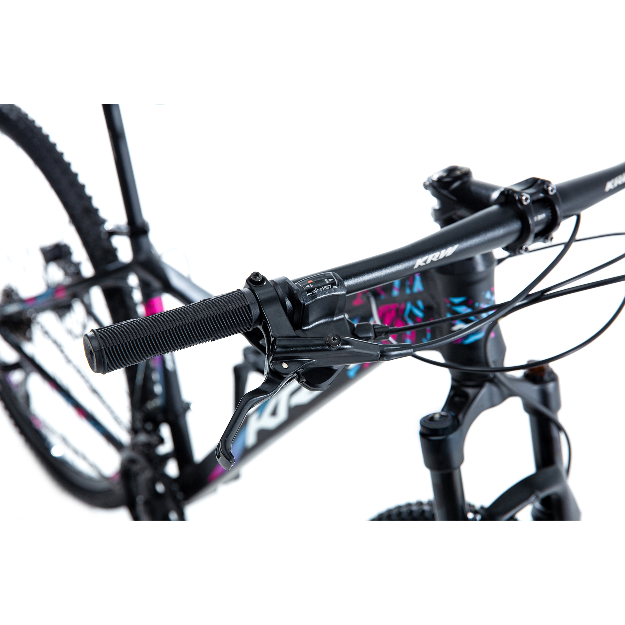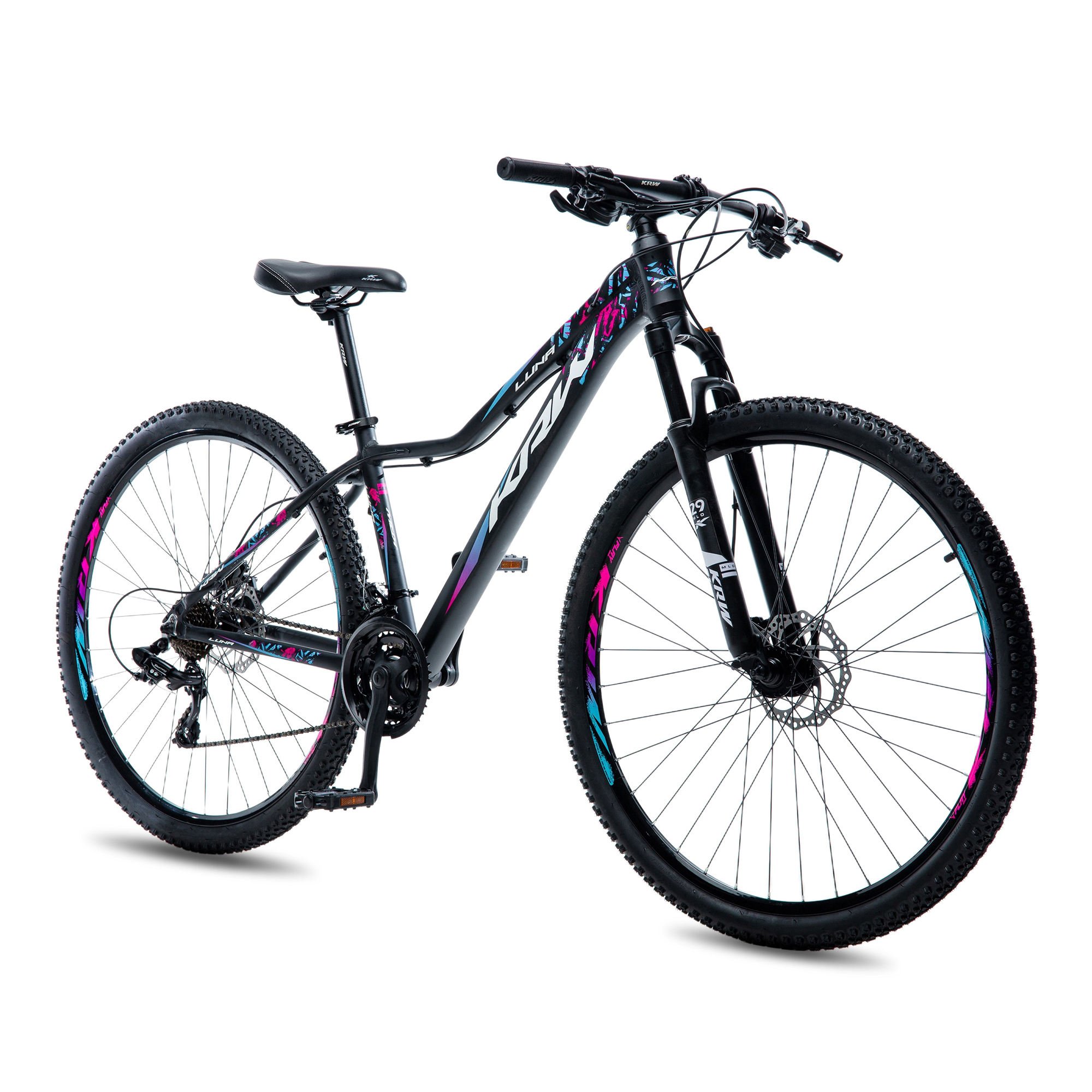Bicicleta Aro 29 KRW Alumínio Shimano TZ 21v Freio a Disco W7 Preto/Rosa e Azul 15.5" Quadro em alumínio 6061 Abraçadeira alumínio de selim 31,8mm Alavancas de câmbio ez-fire 7 velocidades Aro aéro 29 pared dupla 36f Caixa de direção semi integrado Câmbio dianteiro Shimano TZ Câmbio traseiro Shimano TZ Pedivela aço coroa triplo revestido Canote de selim 27.2mm com carrinho Corrente index 7 velocidades Cubo com blocágem Espaçador alumínio 10 mm Garfo suspensão mecânico Guidão alumínio 31.8mm reto Kit cabo com conduiter com teflonn Mesa alumínio 31.8mm Movimento central rolamentado 122mm Pedal em nylon preto Pinça de freio a disco com rotor de 160mm Pneu 29 cravos Raio 285x2.0mm aço preto Roda livre de 7 index Selim mtb