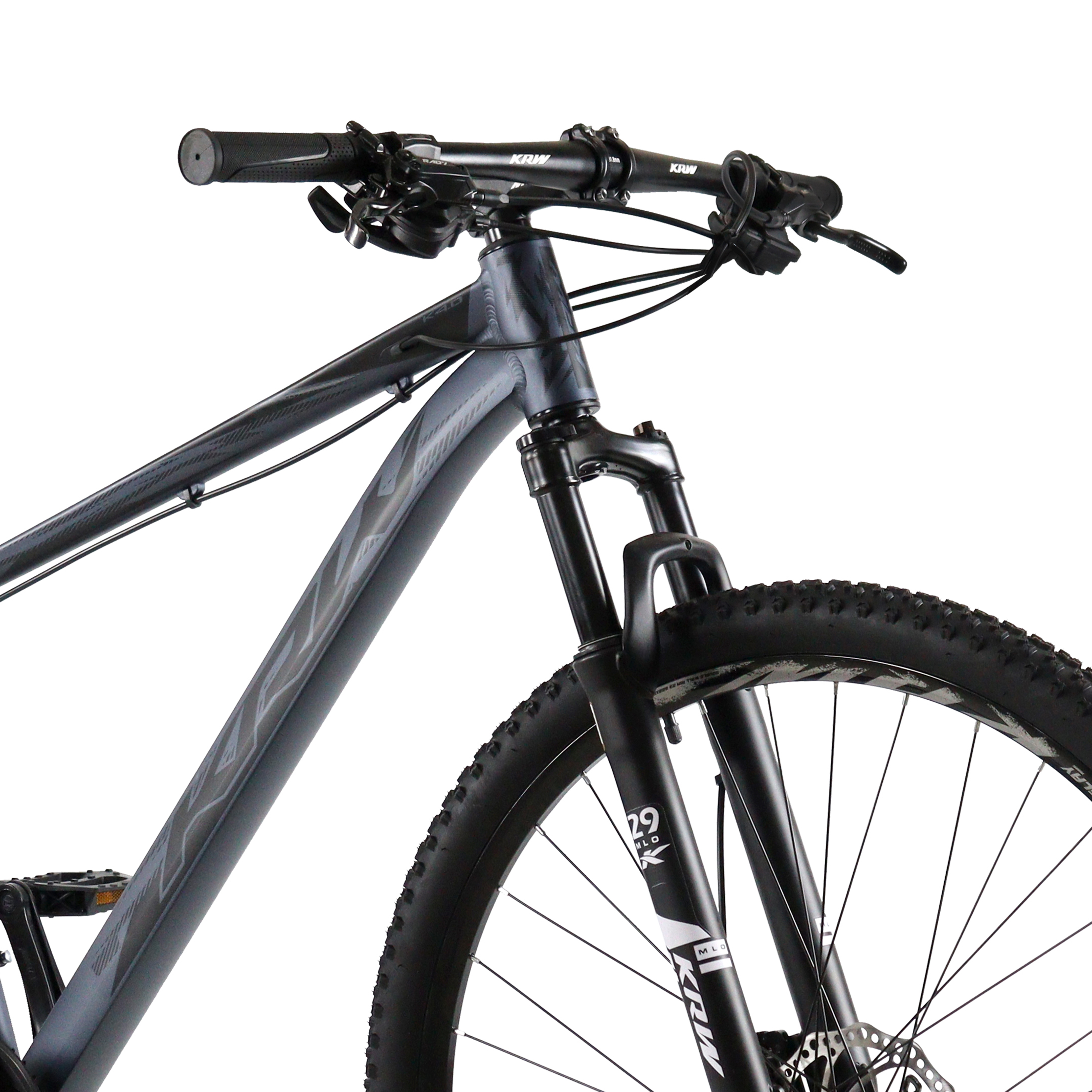 Bicicleta Aro 29 KRW Alumínio 24v Freio Hidráulico com Trava de Ombro Cassete W3 Grafite/Preto 17" Quadro em alumínio 6061 Freio Hidráulico Abraçadeira alumínio de selim 31,8mm com blocagem Alavancas de câmbio rapid-fire 8 velocidades Aro aéro 29 parede dupla Caixa de direção semi-integrado Câmbio dianteiro Importado Câmbio traseiro Importado Câmera de ar 29 Pedivela coroa triplo alumínio Canote de selim 27.2mm com carrinho Corrente index 8 velocidades Cubo alumínio cassete com blocágem Espaçador alumínio 10 mm Garfo suspensão 29 com Trava Guidão alumínio 31.8 mm reto Mesa alumínio 31.8 mm Kit cabo com conduiter com teflonn Movimento central rolamentado 122mm Pedal plataforma com refletor Pneu 29 Raio 285x2.0mm aço preto Cassete 8 velocidades index Selim mtb